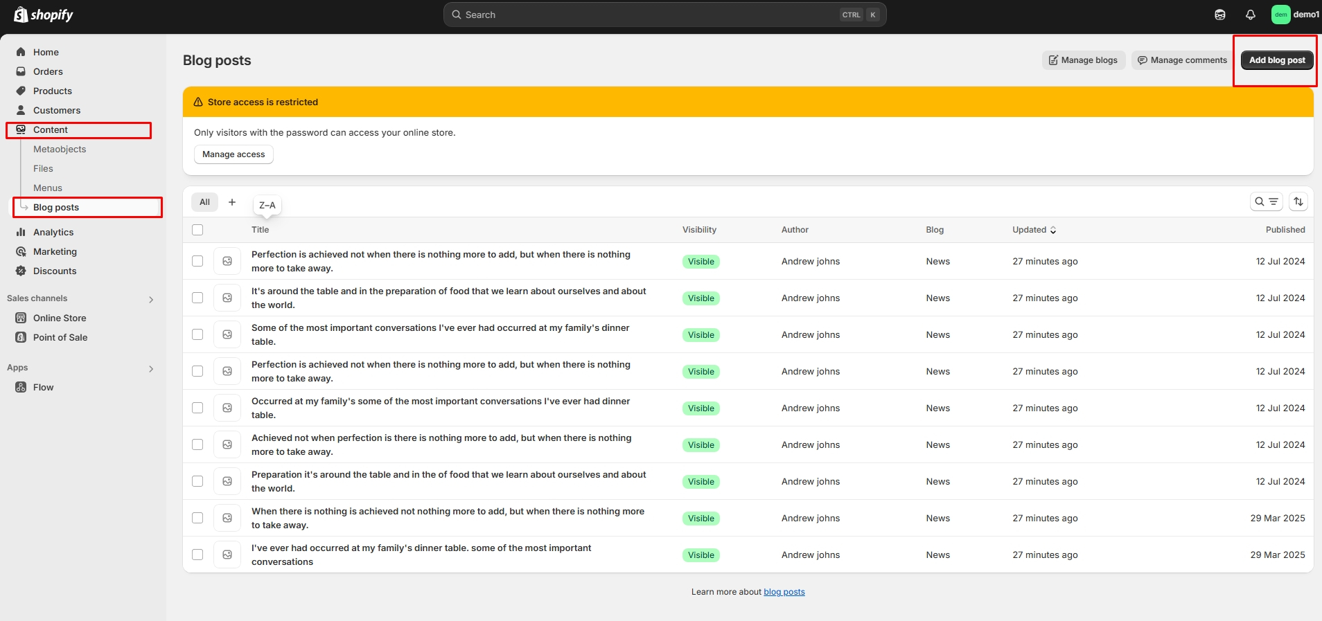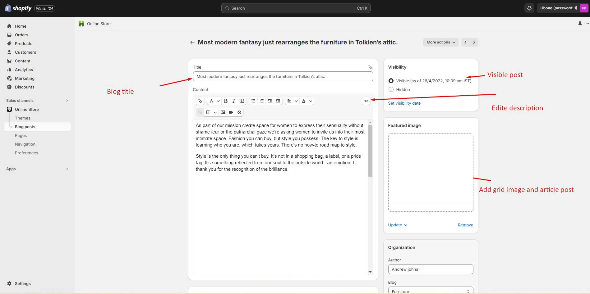 Left sidebar under Online store > Blog after logging into the admin panel