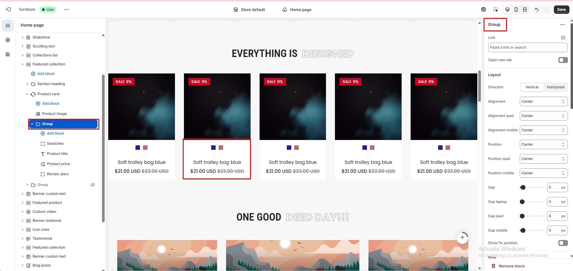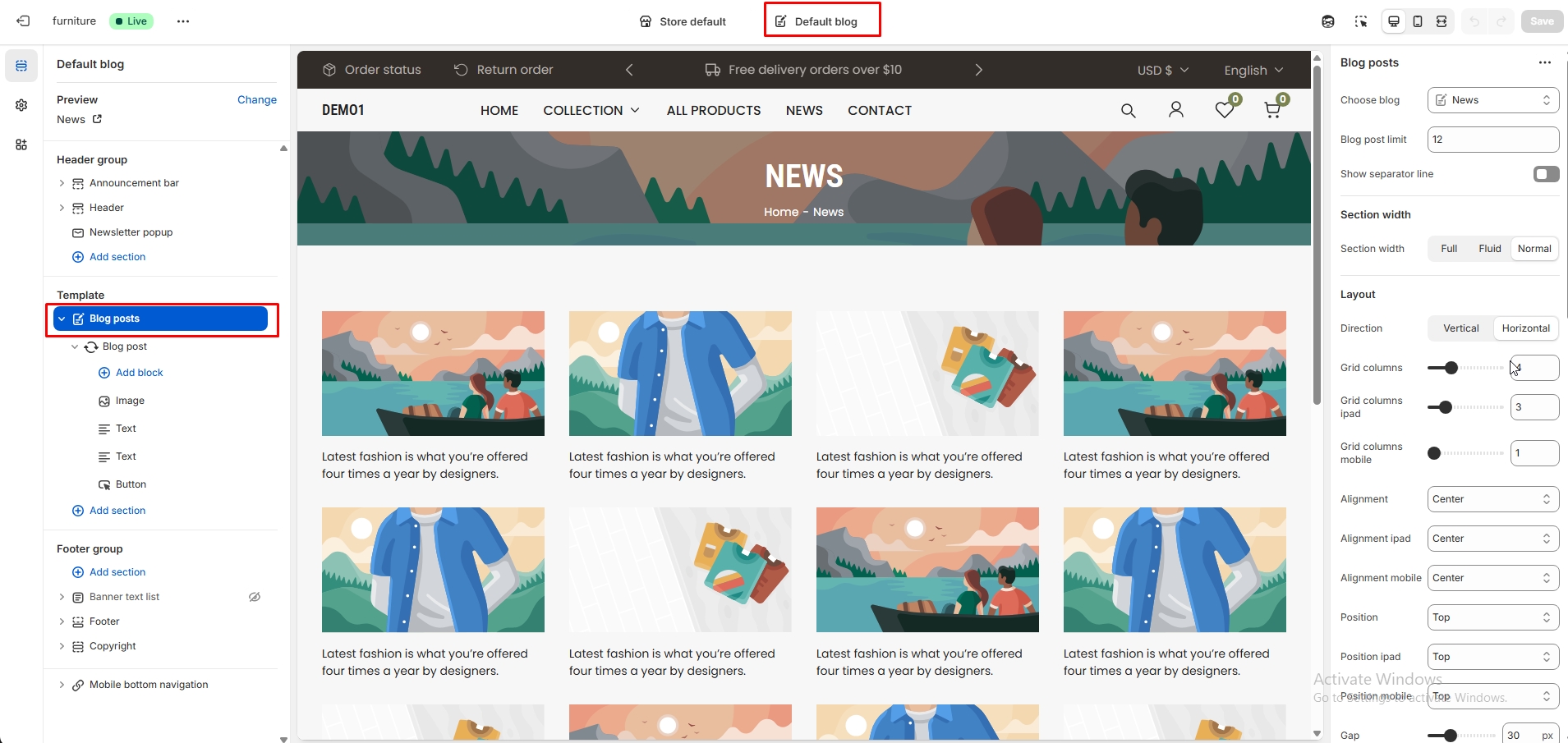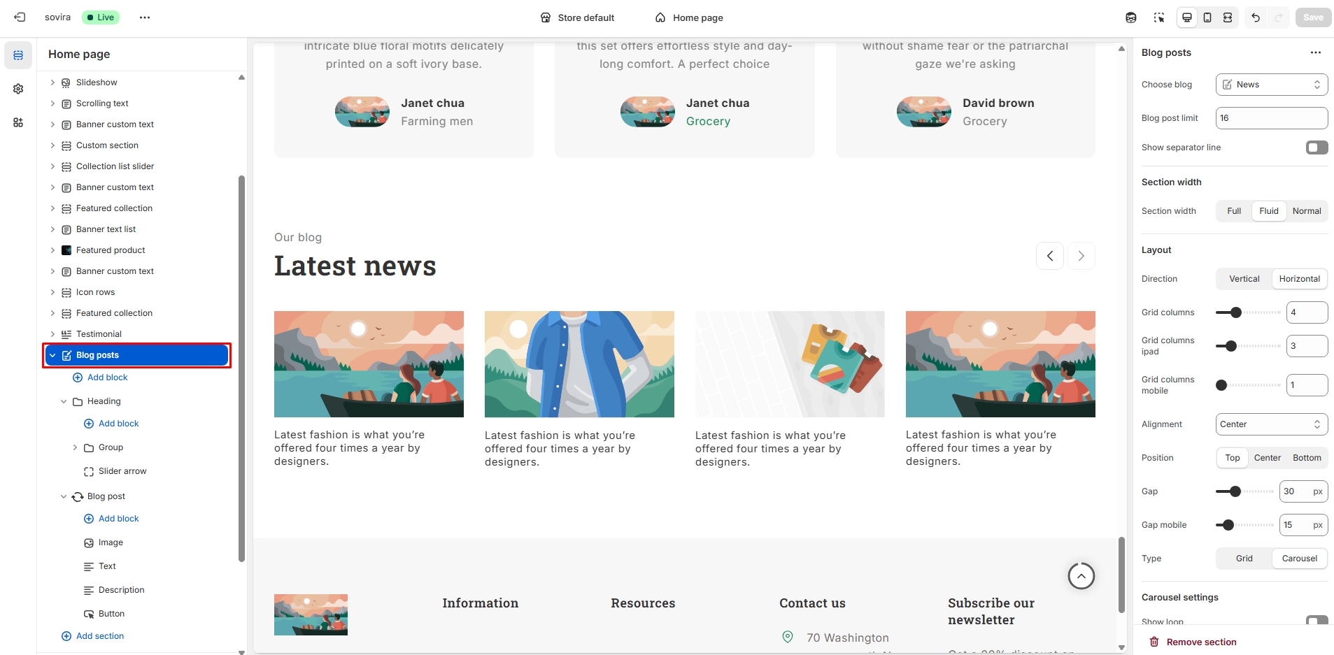 For add section, Top bar > Homepage > Blogpost click. When the right sidebar panel opens, space top(desktop, mobile), space bottom(desktop, mobile), section background color, grid view, subheading, heading, choose blog, button label, button view and many more option are availabel for customization.