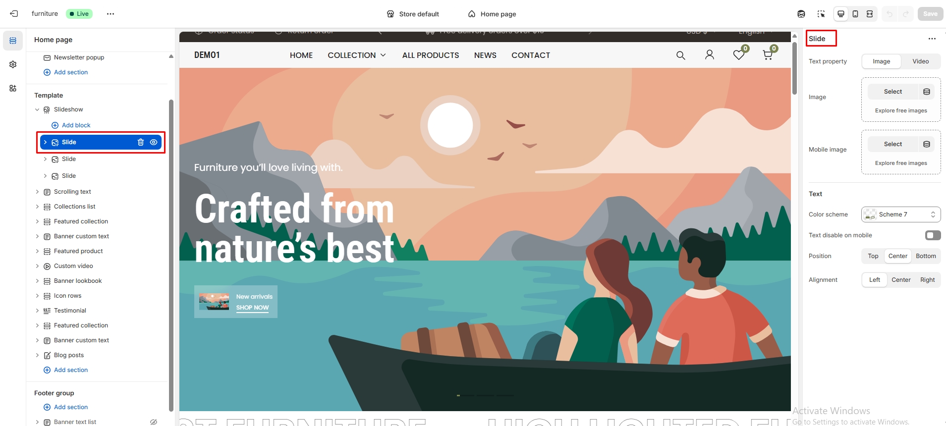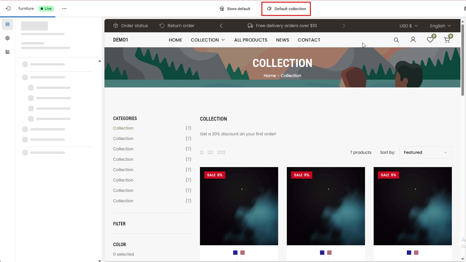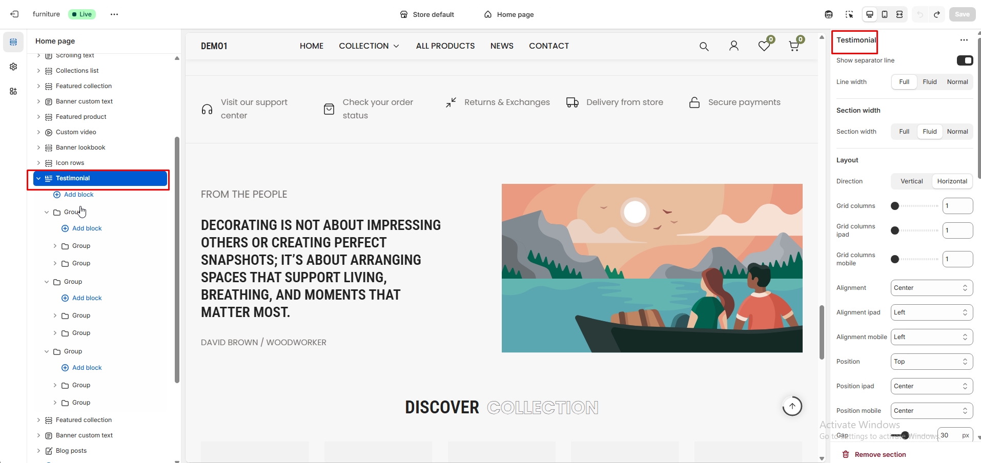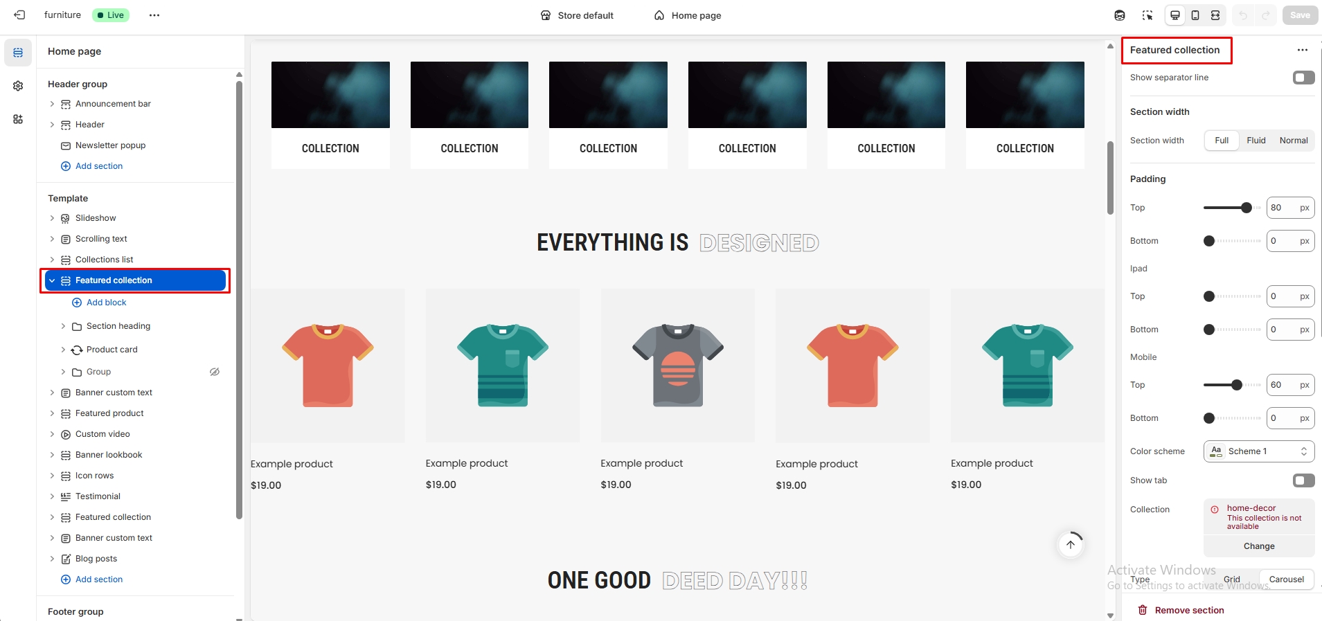 The left sidebar Collection click. When the right sidebar panel opens, select collection, collection image and text alignment option are availabel for customization.