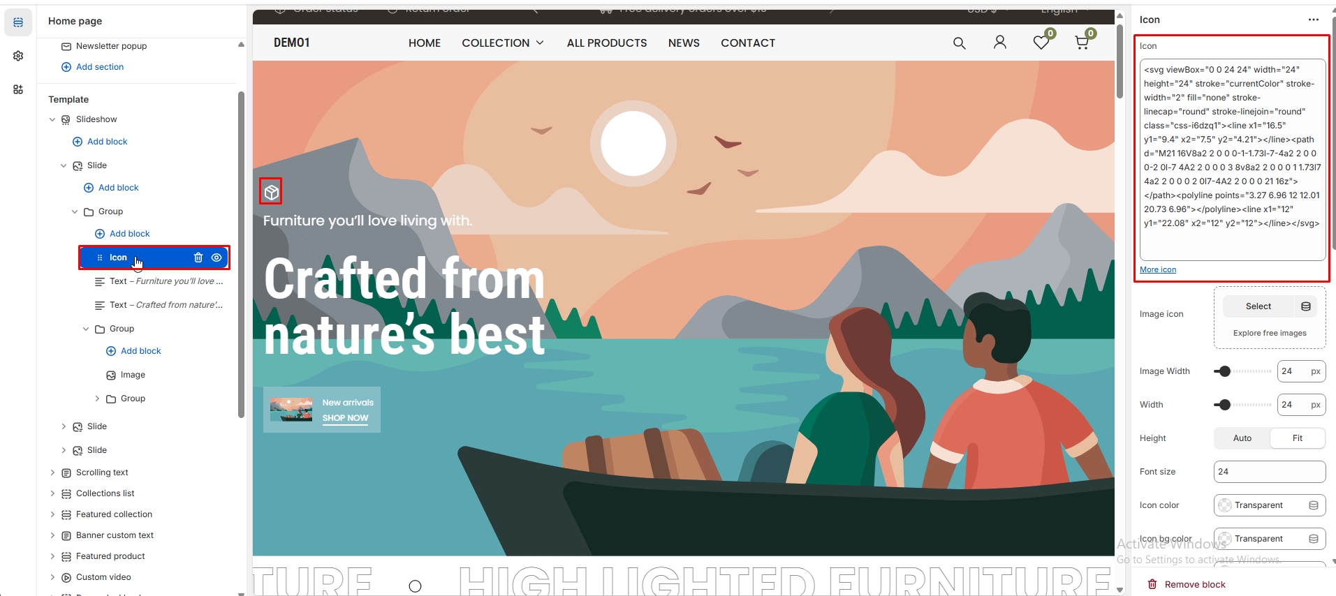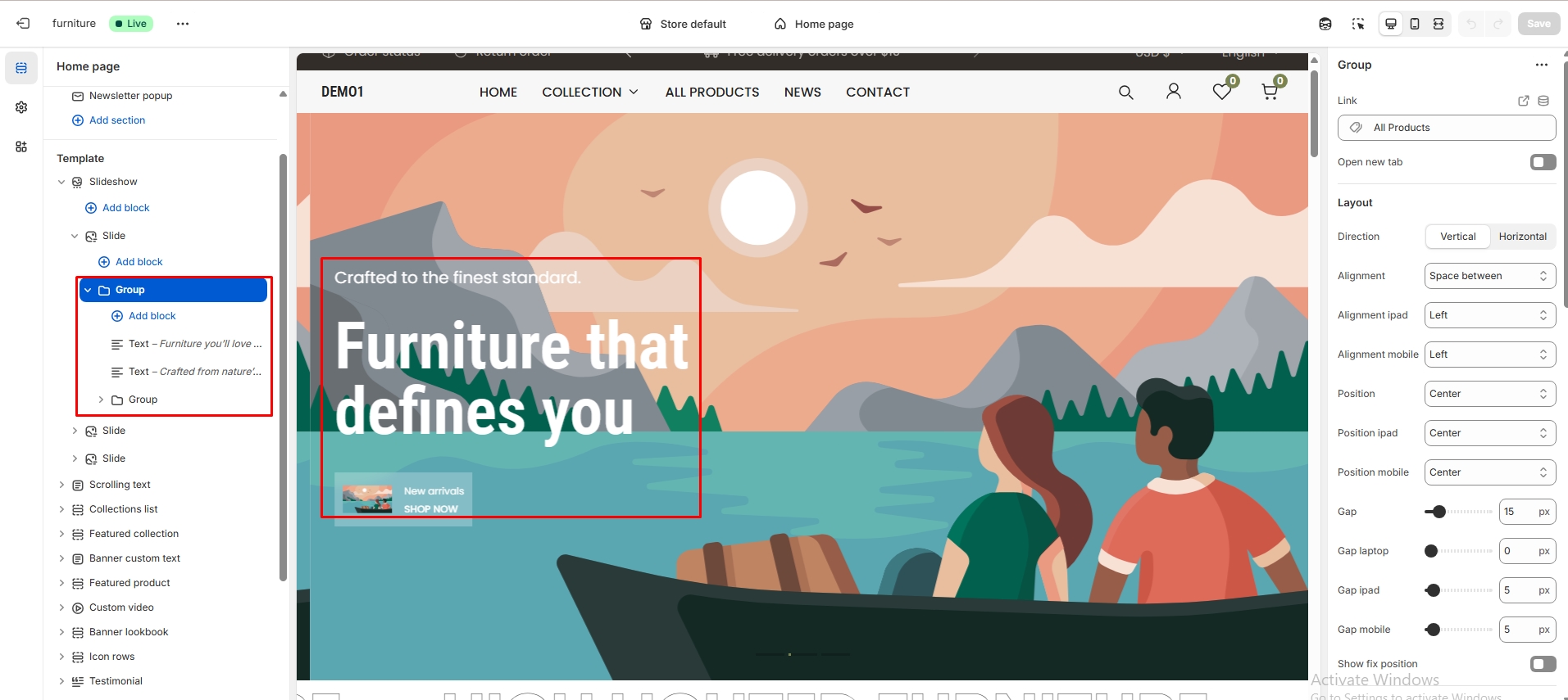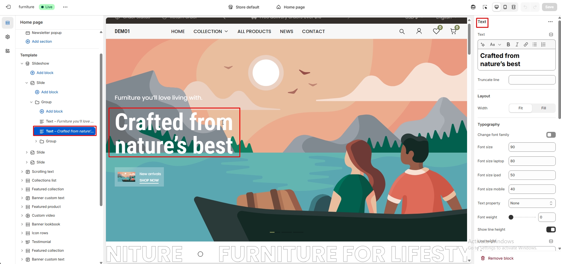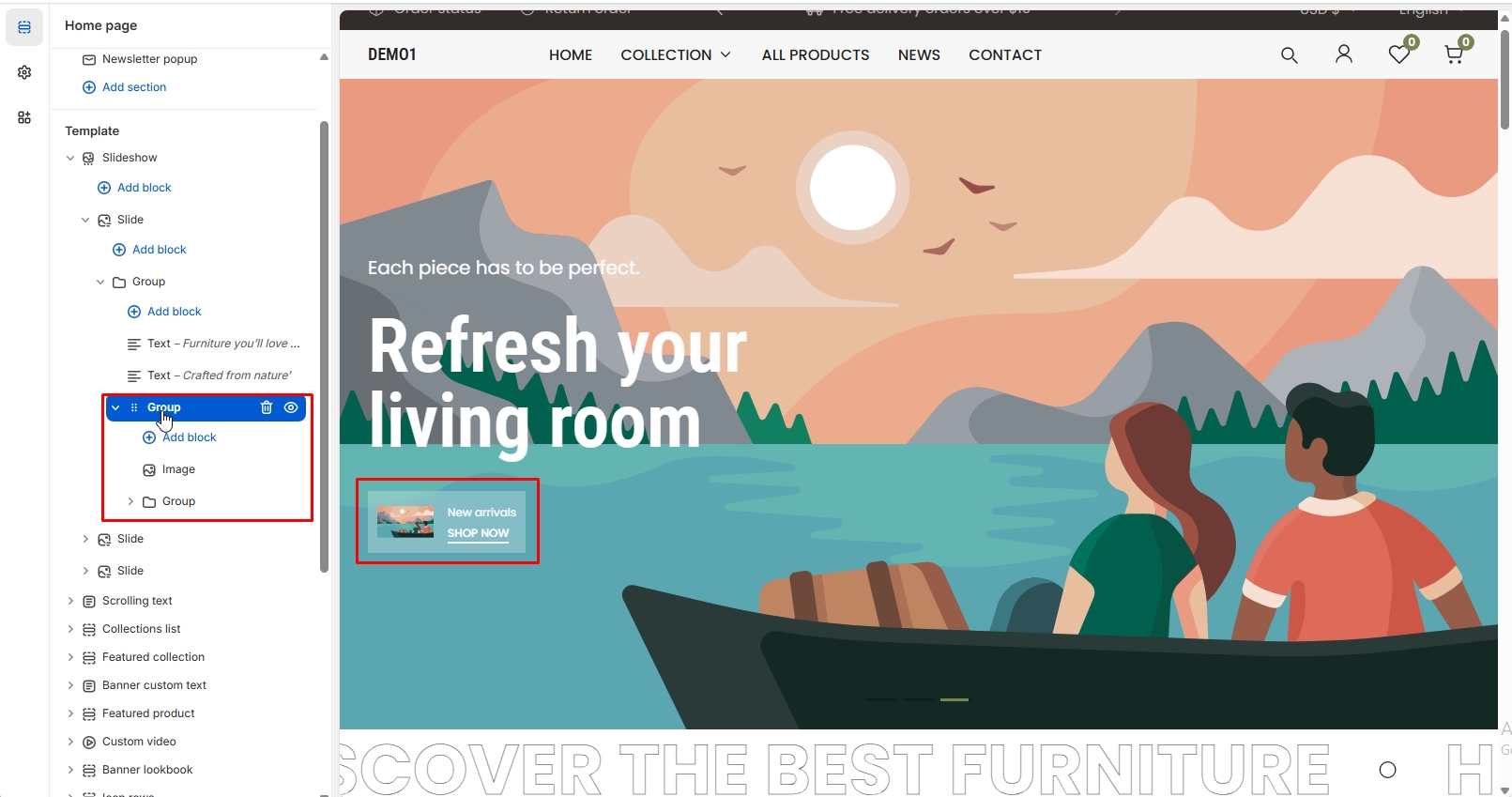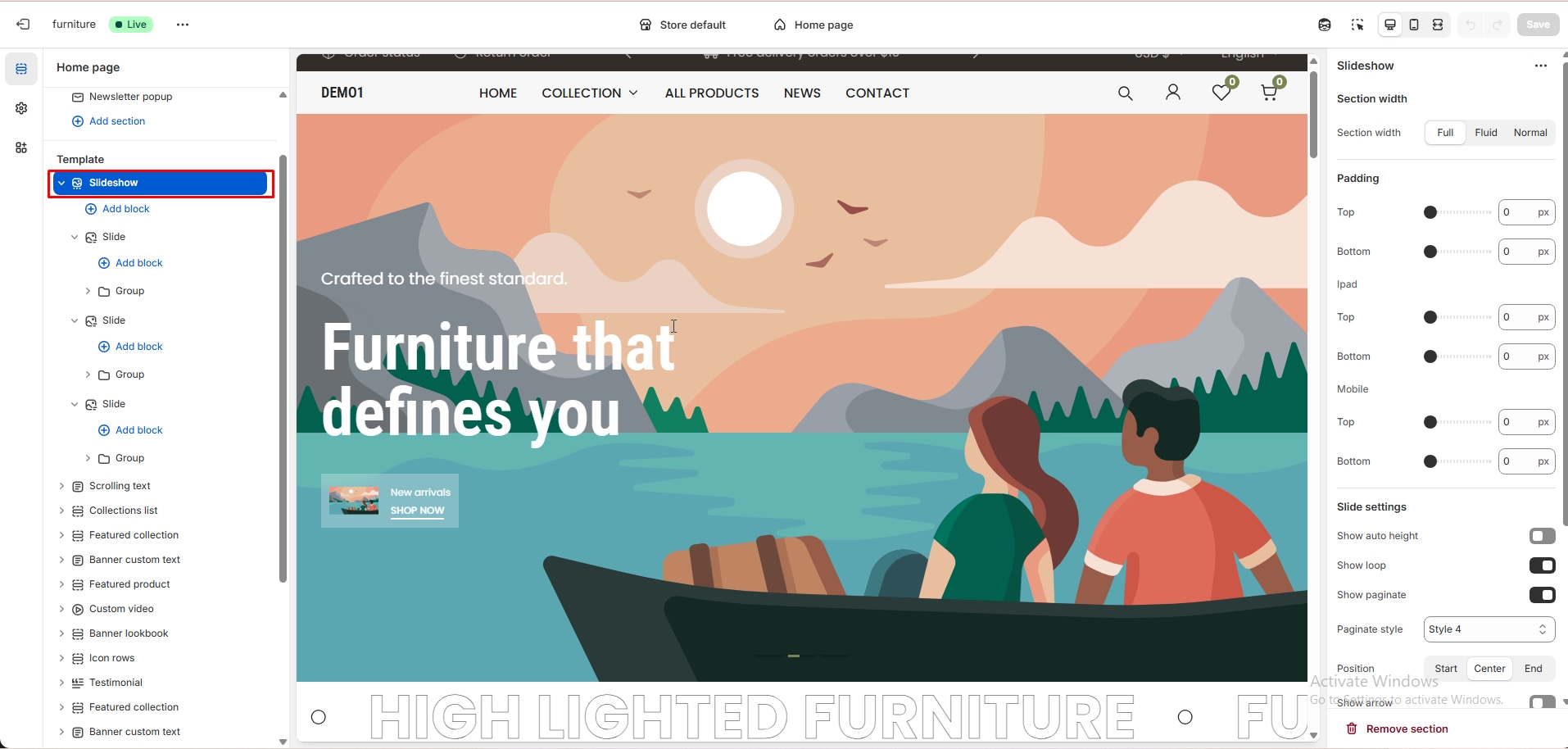 The left sidebar Collection click. When the right sidebar panel opens, select collection, collection image and text alignment option are availabel for customization.