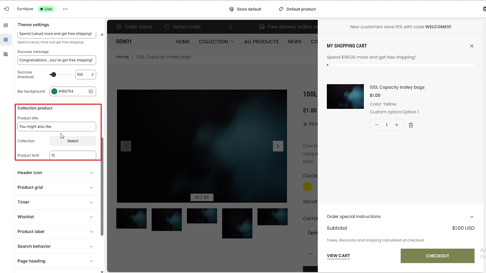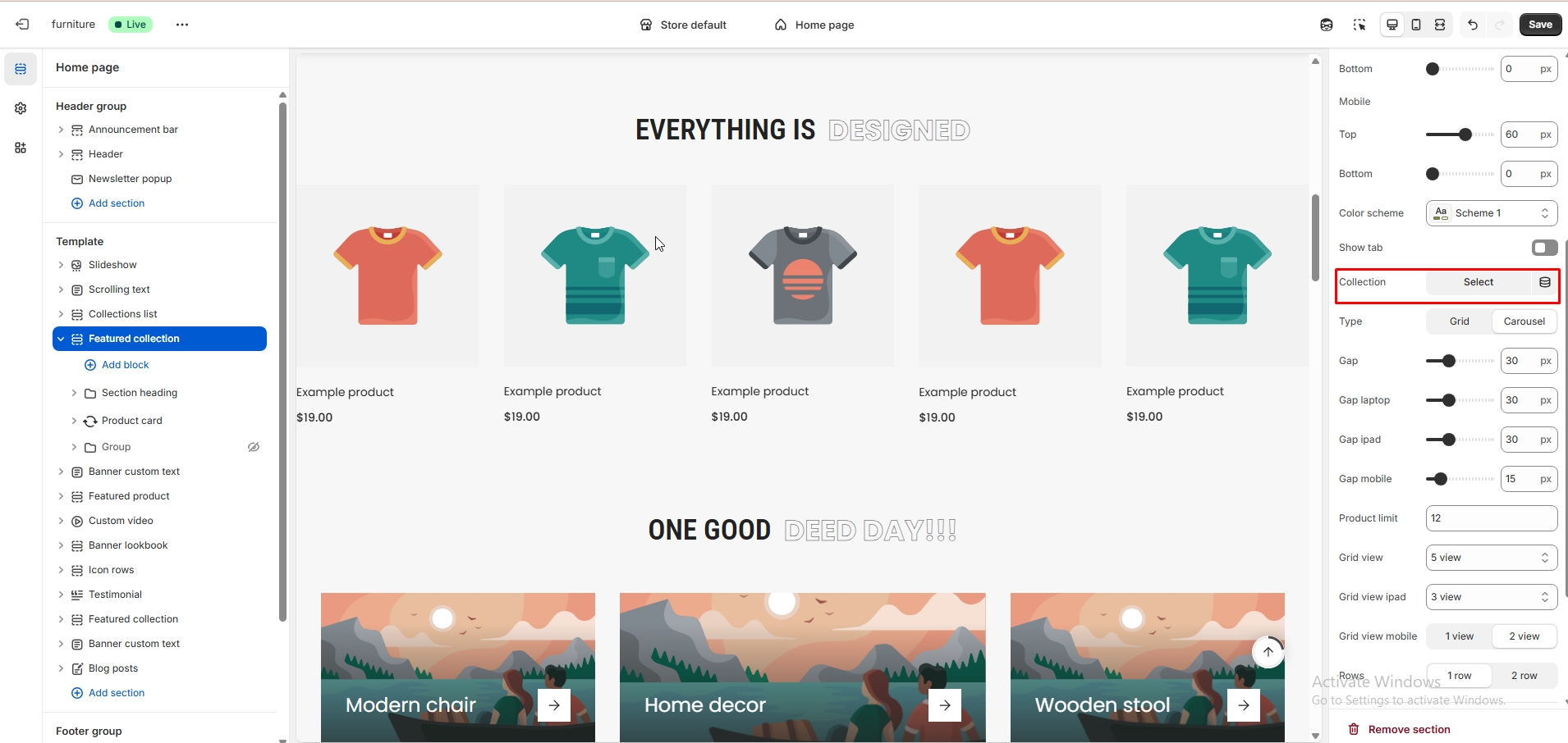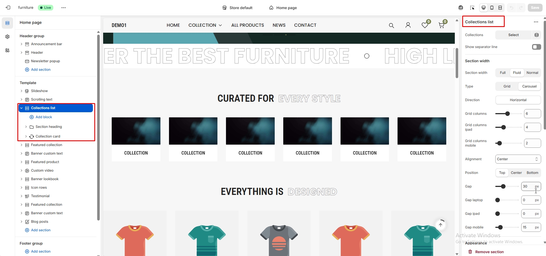 The left sidebar Collection list click. When the right sidebar panel opens, space top(desktop, mobile), space bottom(desktop, mobile), section background color, subheading, heading, show items heading are availabel for customization.