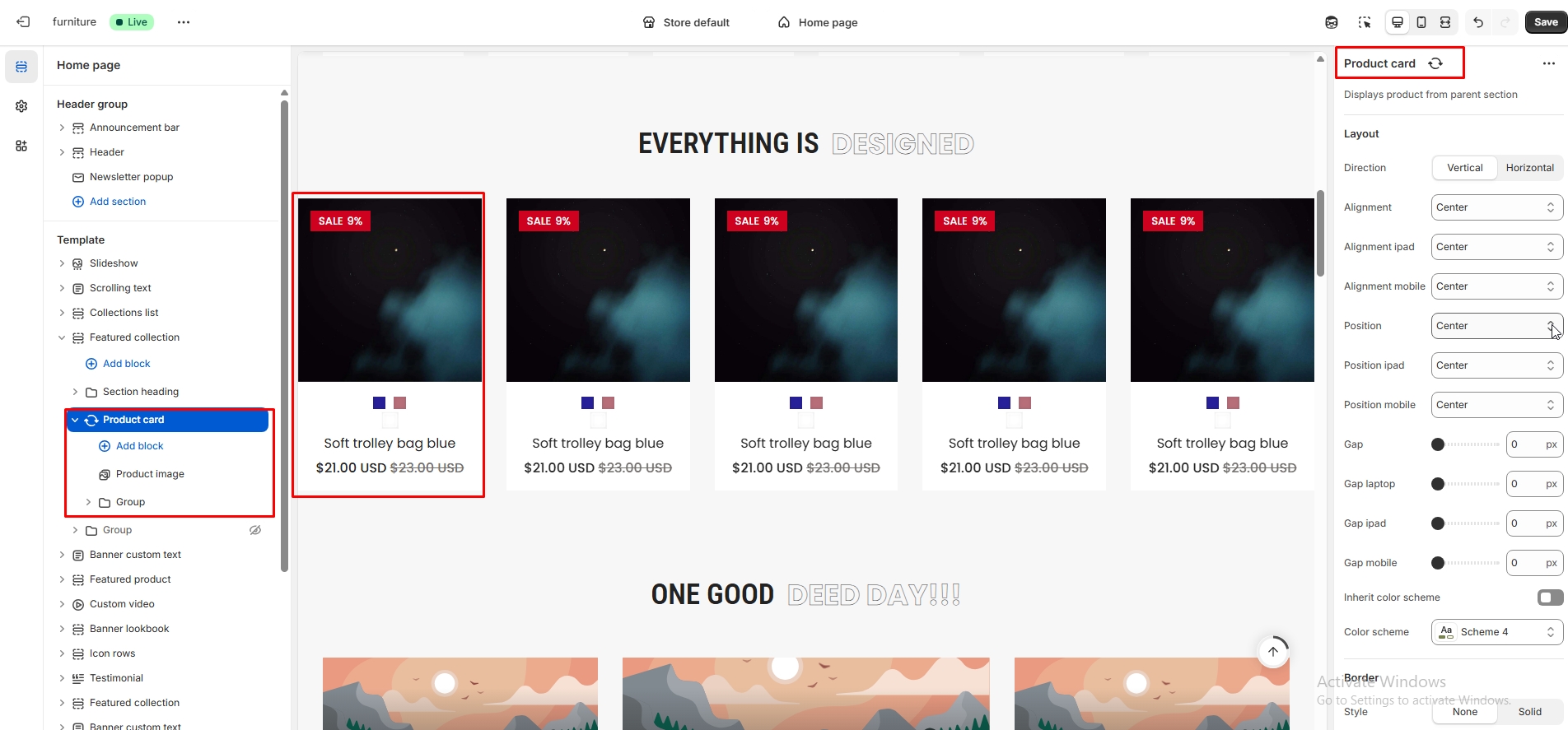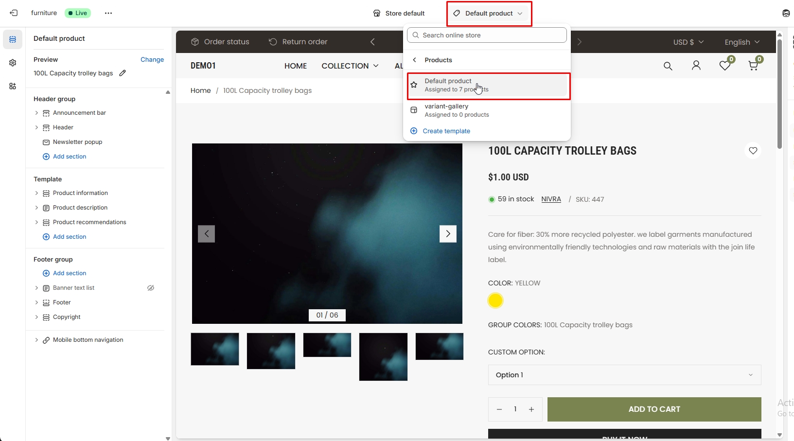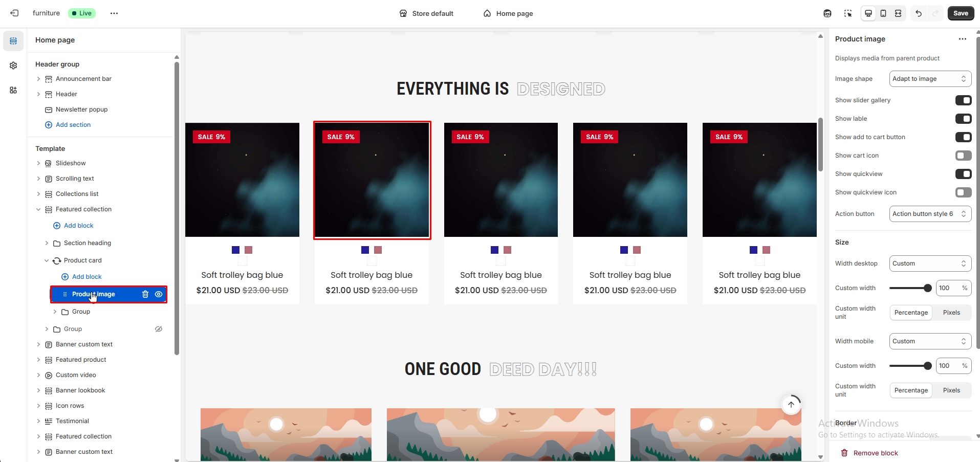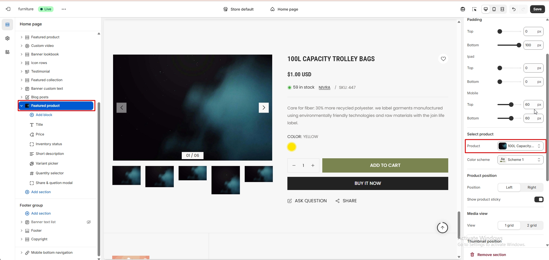 The left sidebar Featured product click. When the right sidebar panel opens, space top(desktop, mobile), space bottom(desktop, mobile), section background color, subheading, heading, select product, product position option, product image position, product zoom, image ratio and many more option are availabel for customization.