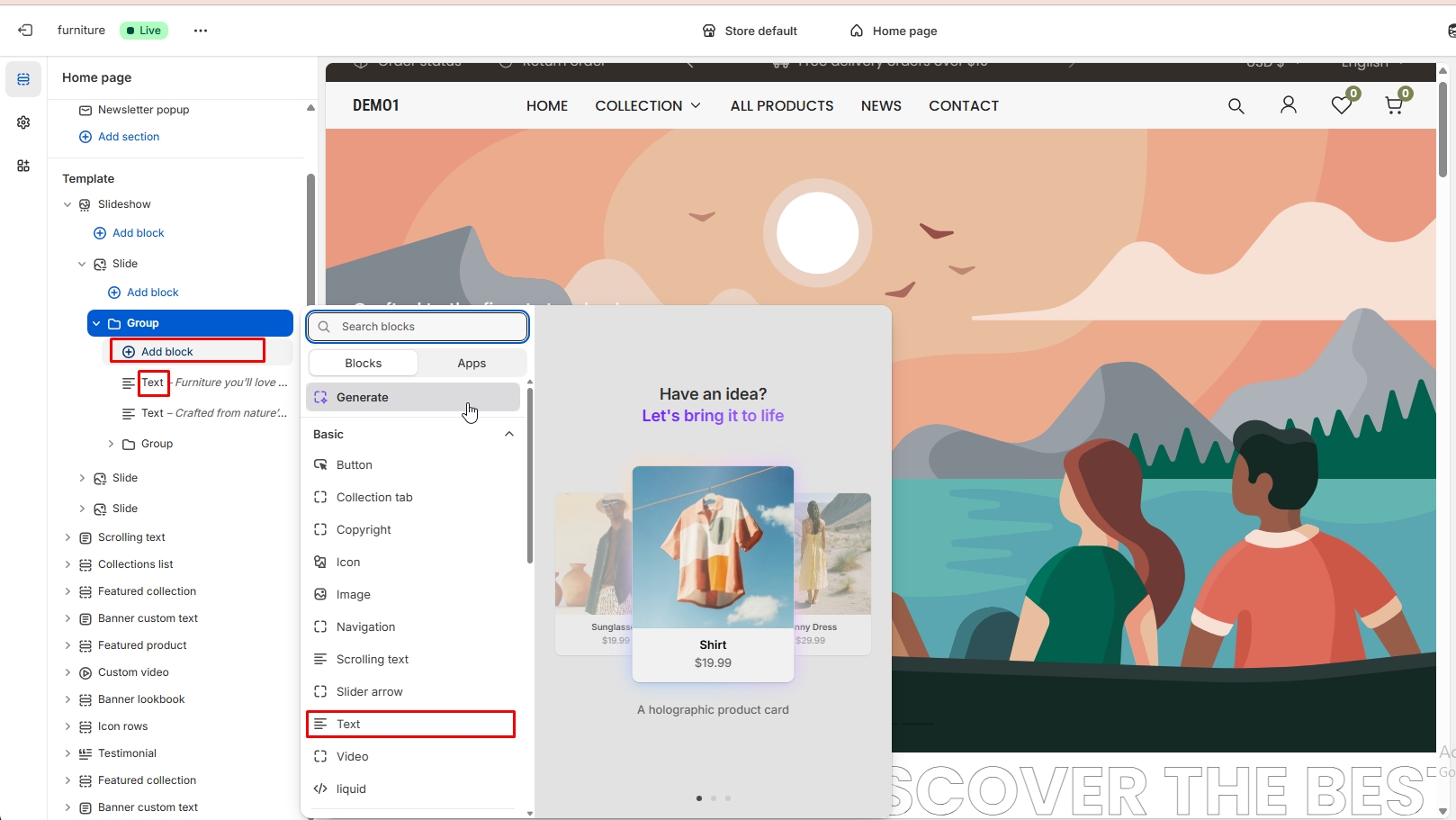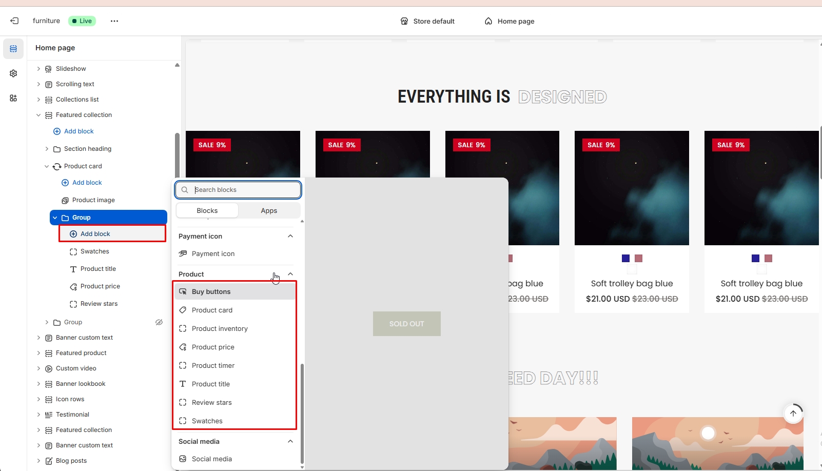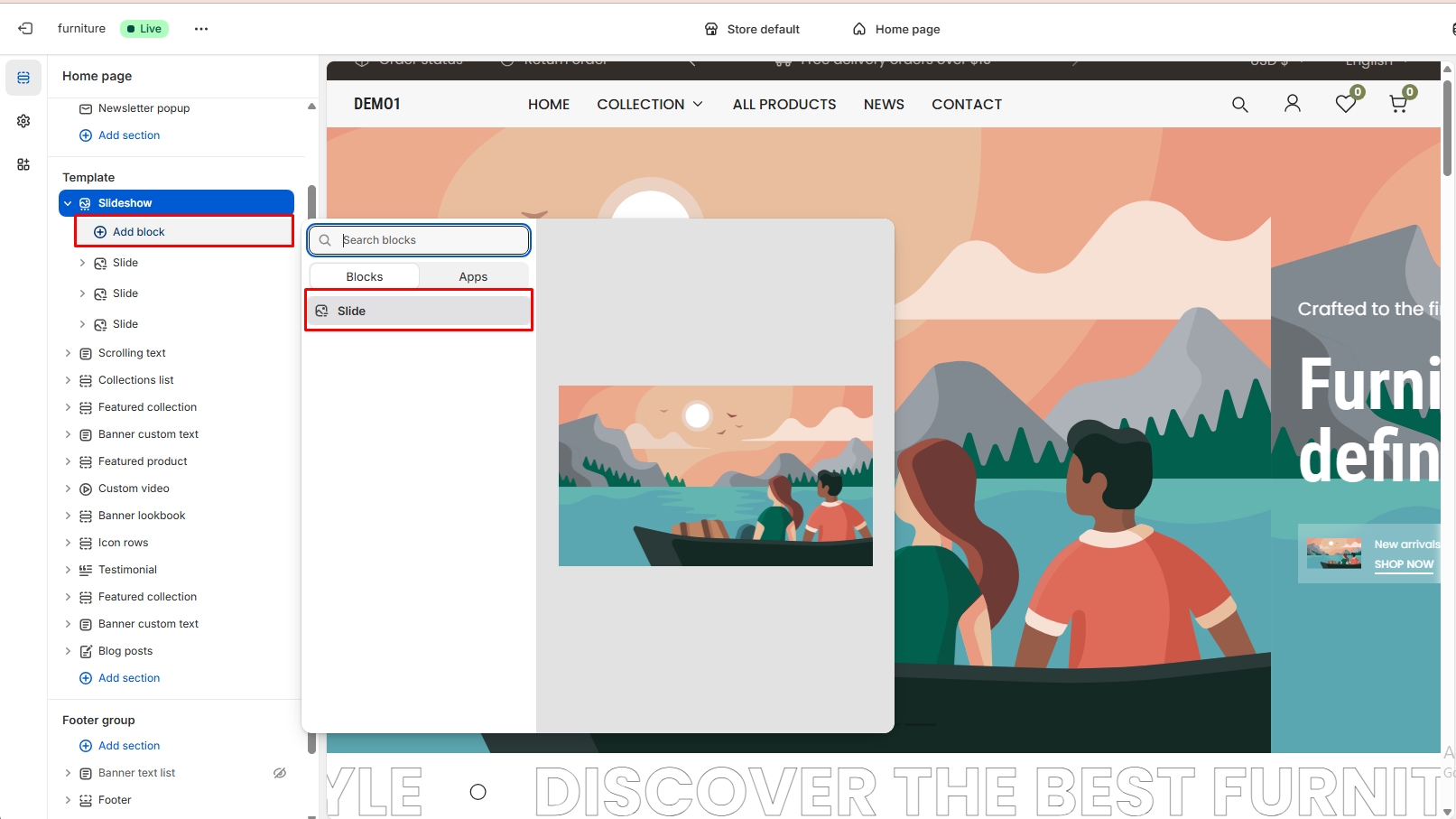 Top bar > Homepage > Header > Add block