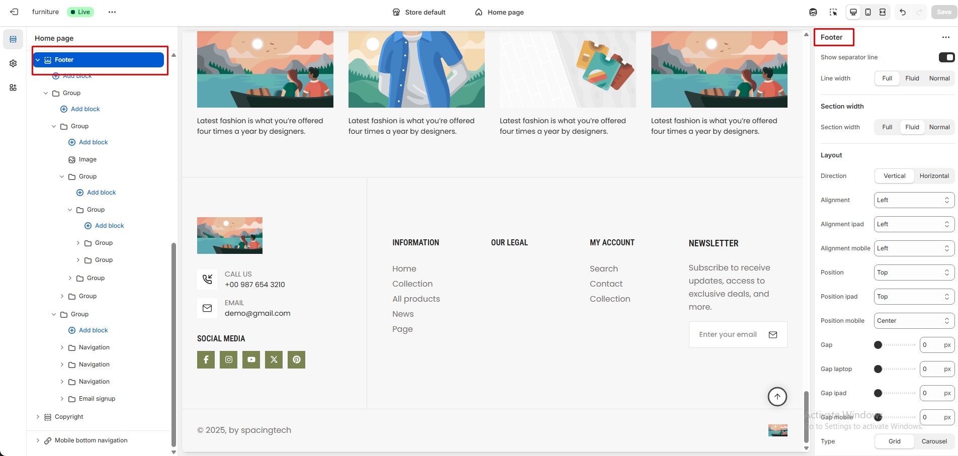 The left sidebar Footer click. When the right sidebar panel opens, space top(desktop, mobile), space bottom(desktop, mobile), section background color, section background image, grid view, subheading, heading, and many more option are availabel for customization.