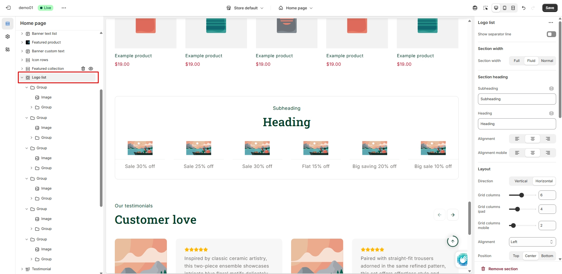 The left sidebar Logo list click. When the right sidebar panel opens, space top(desktop, mobile), space bottom(desktop, mobile), section background color, section background image, grid view, subheading, heading and many more option are availabel for customization.