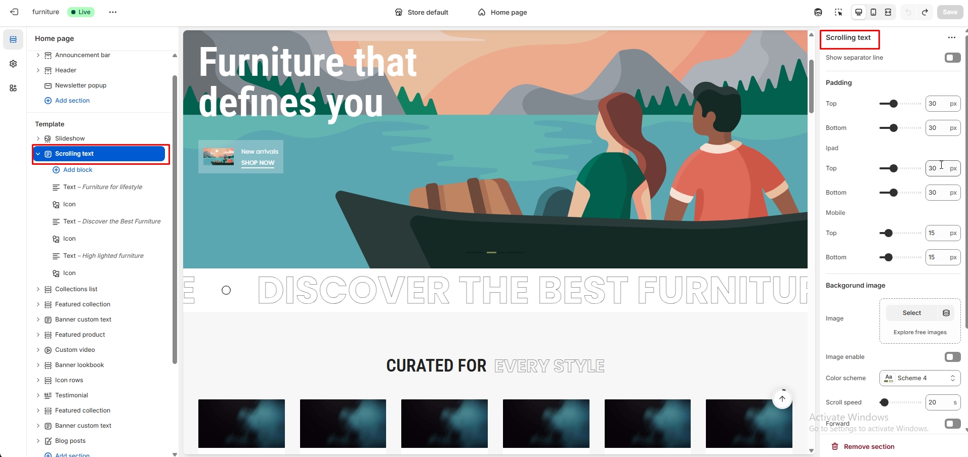 The left sidebar Scrolling text click. When the right sidebar panel opens, space top(desktop, mobile), space bottom(desktop, mobile), section background color, section background image, text color, subheading, heading, select product, product position option, product image position, product zoom, image ratio and many more option are availabel for customization.