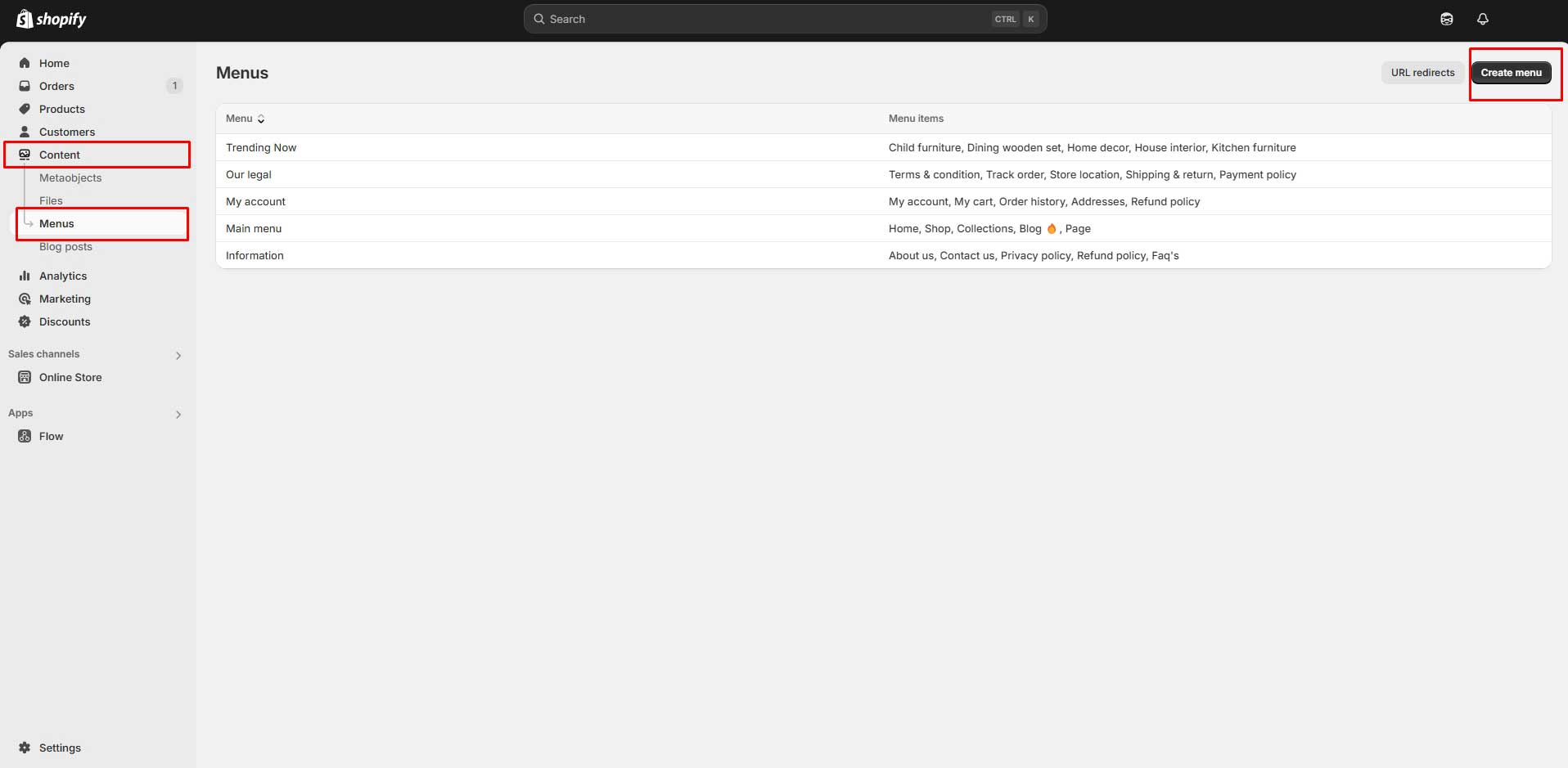 2. Left sidebar under Online store > Navigation > Menus after logging into the admin panel