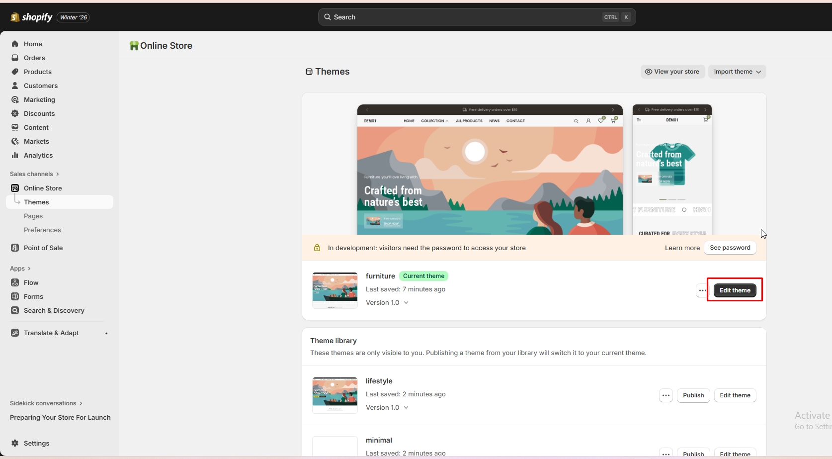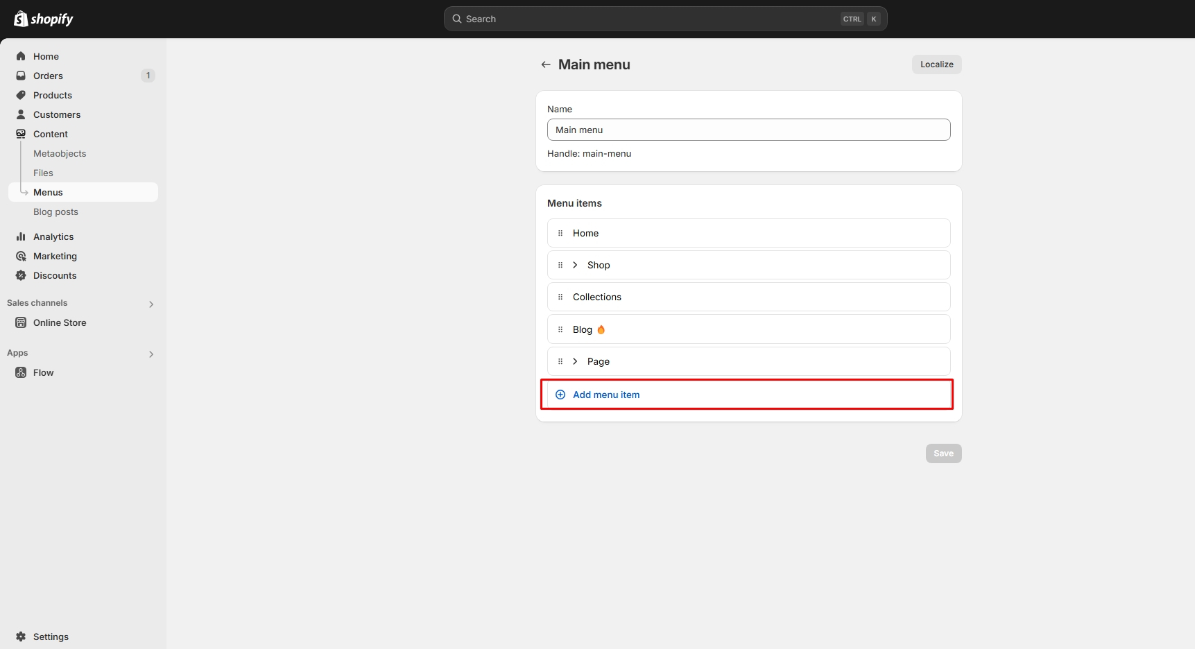 Left sidebar under Online store > Navigation > Menus after logging into the admin panel