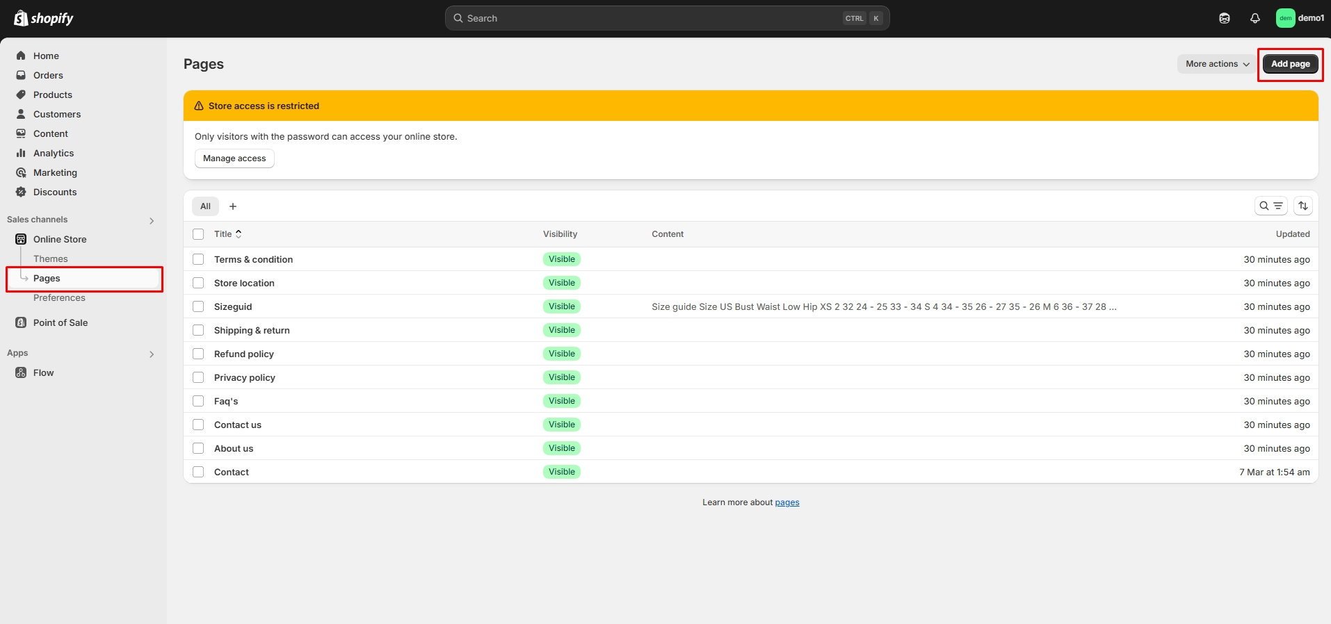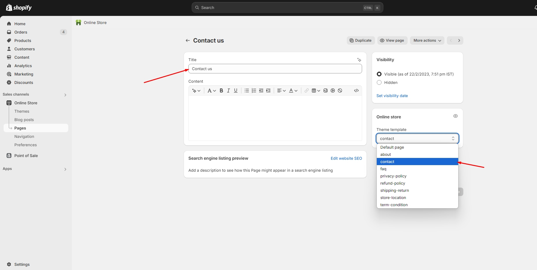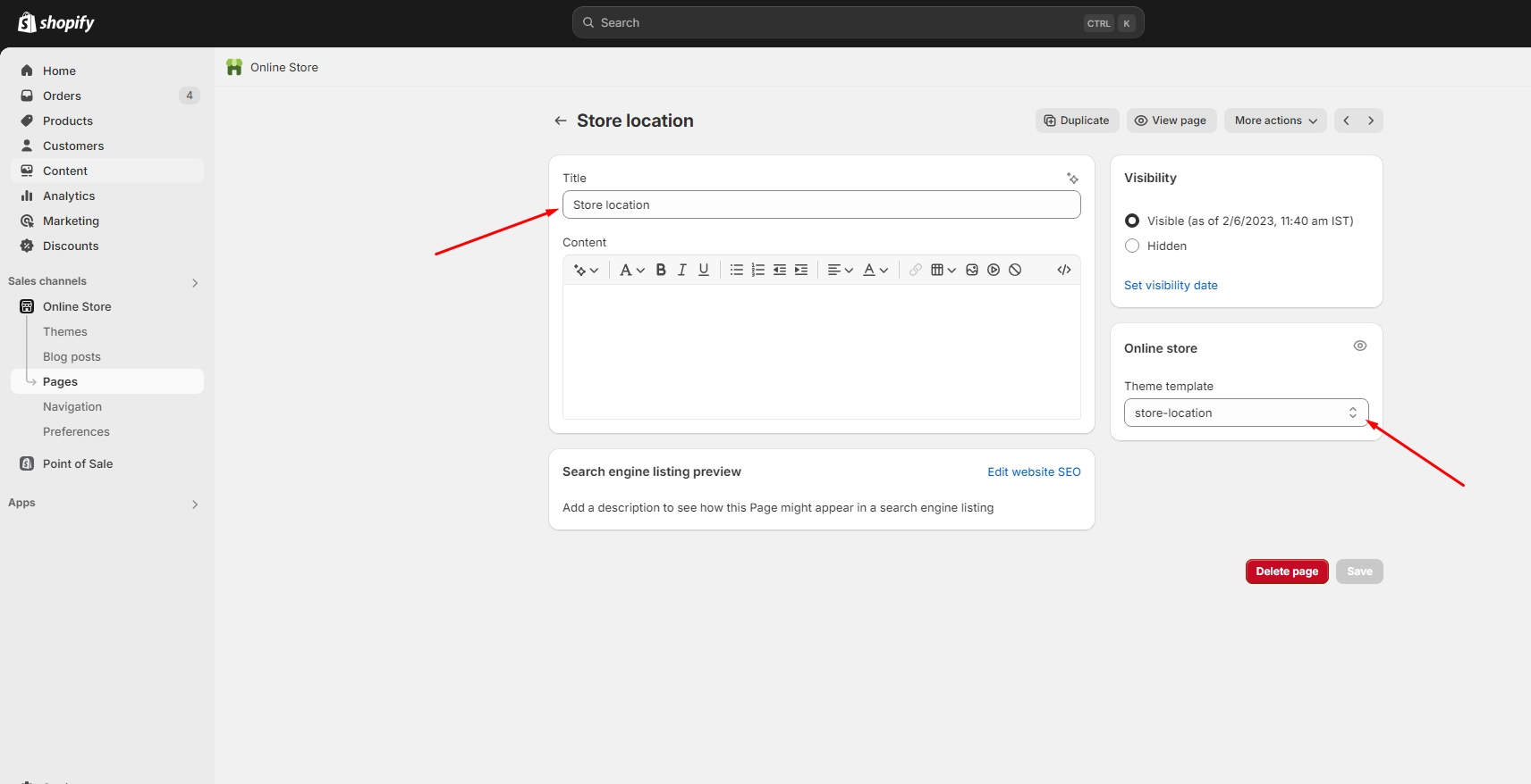Left sidebar under Online store > Pages > Customize after logging into the admin panel