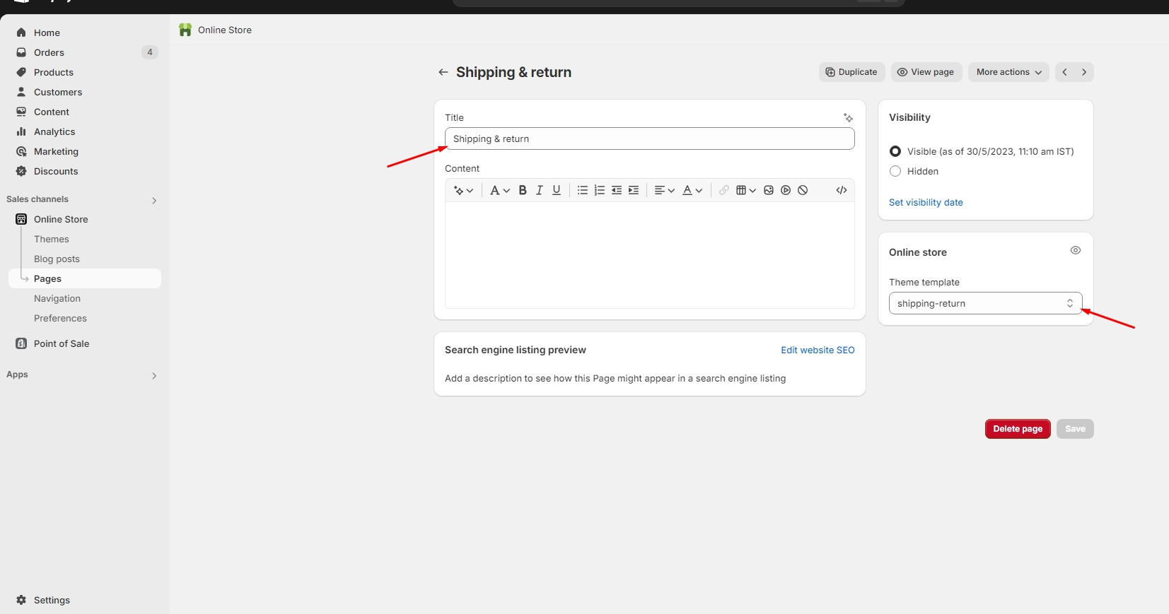 Top bar Select Page > Shipping & Return
