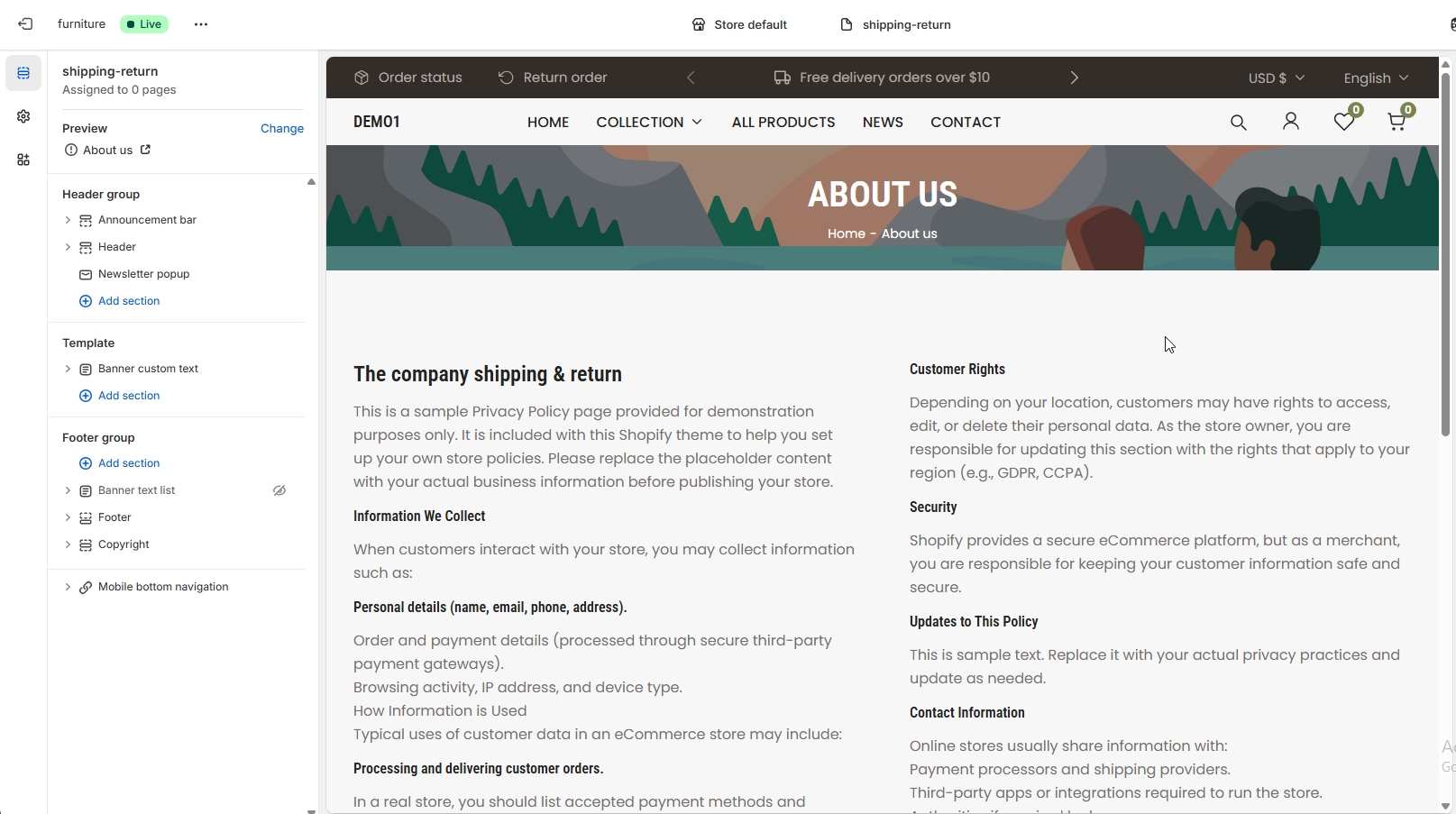 The left sidebar Different types of sections are availabel for the Shipping & Return page. These include the Refund policy text, Sharing personal information, Subheading right, Text point right and more.