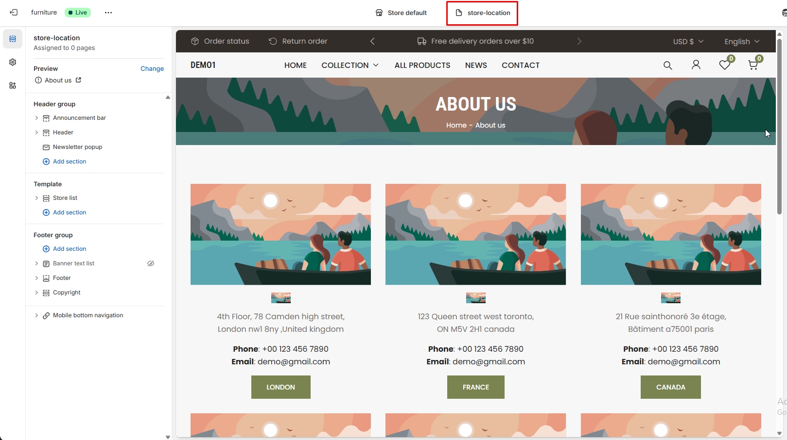 The left sidebar Different types of sections are availabel for the Store Location page. These include the Store location multirow, Image and more.