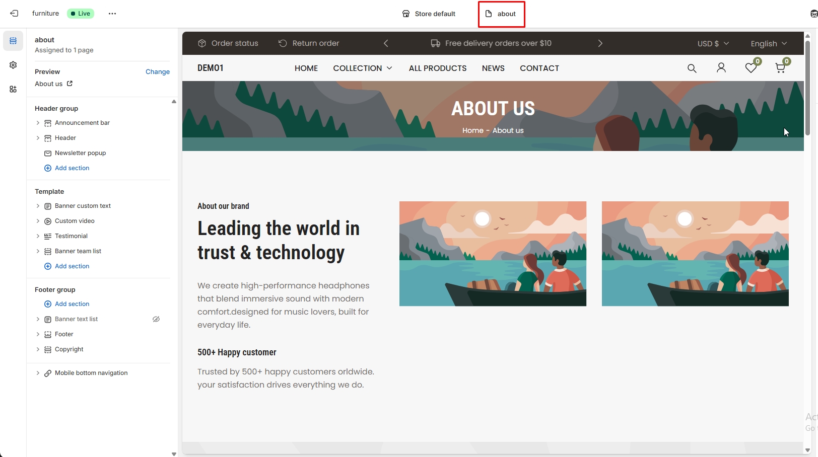 The left sidebar Different types of sections are availabel for the about page. These include the about us banner, about us multicolumn, about us testimonials,about us banner text columns,about us team list and more.