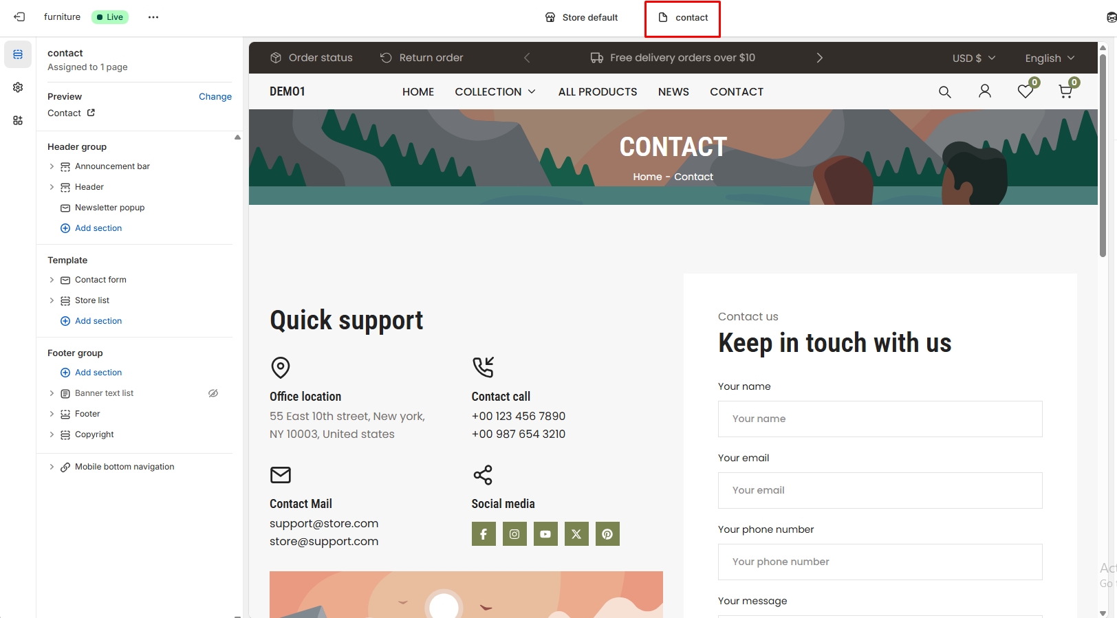 The left sidebar Different types of sections are availabel for the contact page. These include the about us icon row, contact location list, contact form and more.