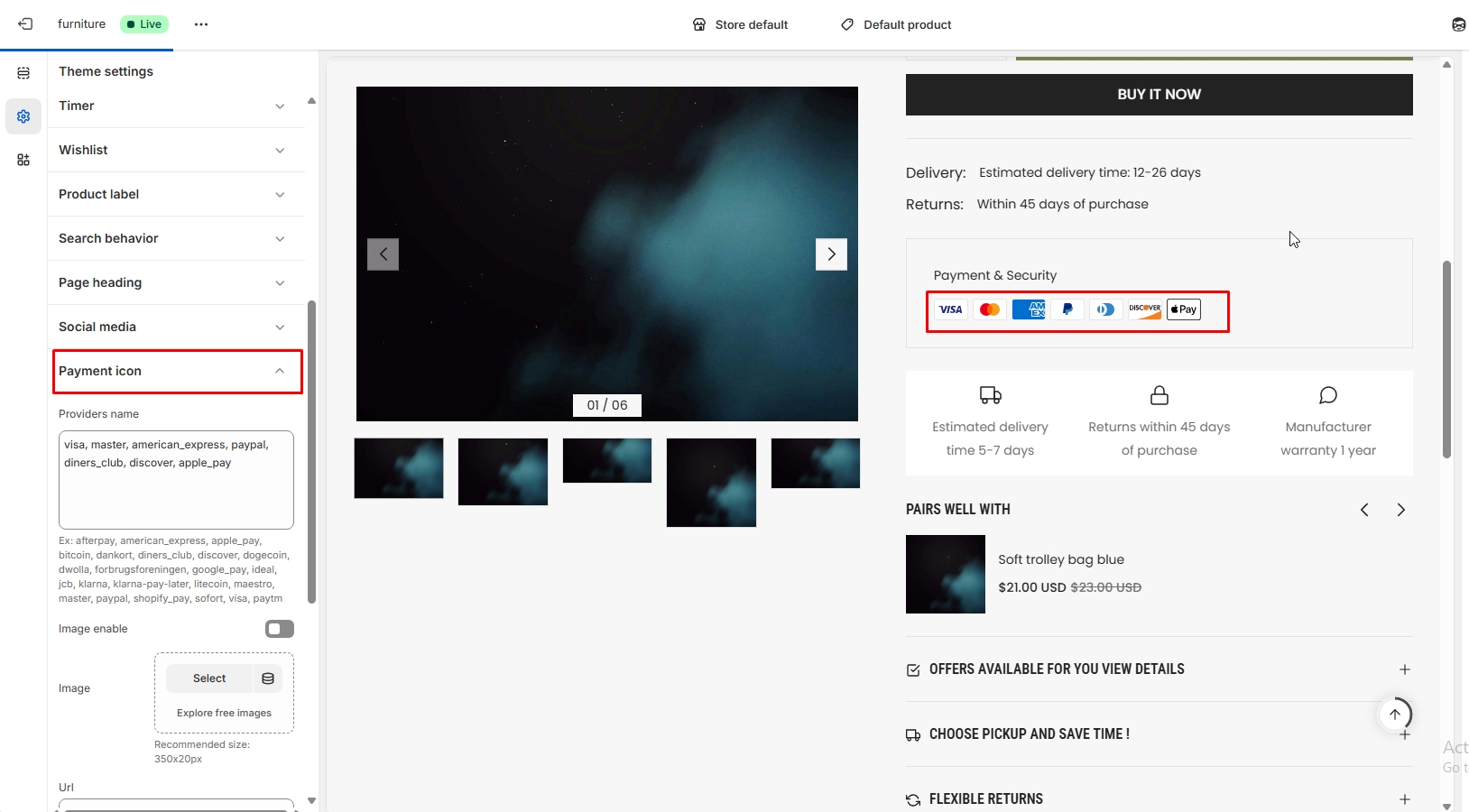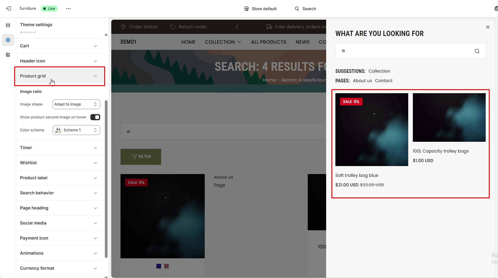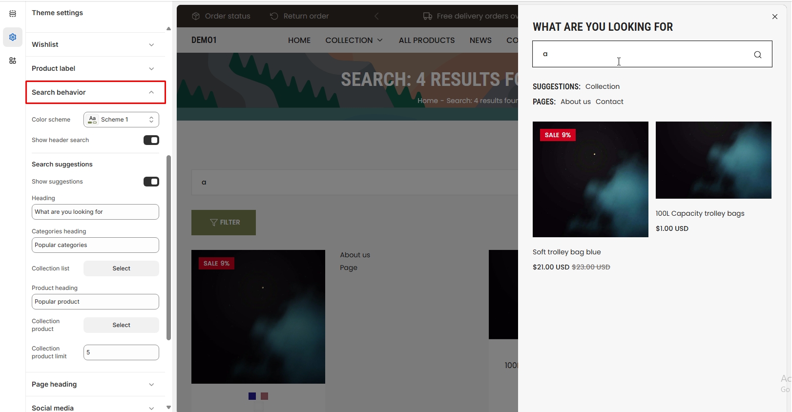 Click on the second little icon in the left sidebar on left corner. After the left sidebar panel opens, you can customize the following: search behavior, page padding, blog posts, social media, payment icon, currency format, logo, color, font, input-textarea-select, layout, button type, cart type, product grid, product badges, and custom CSS.