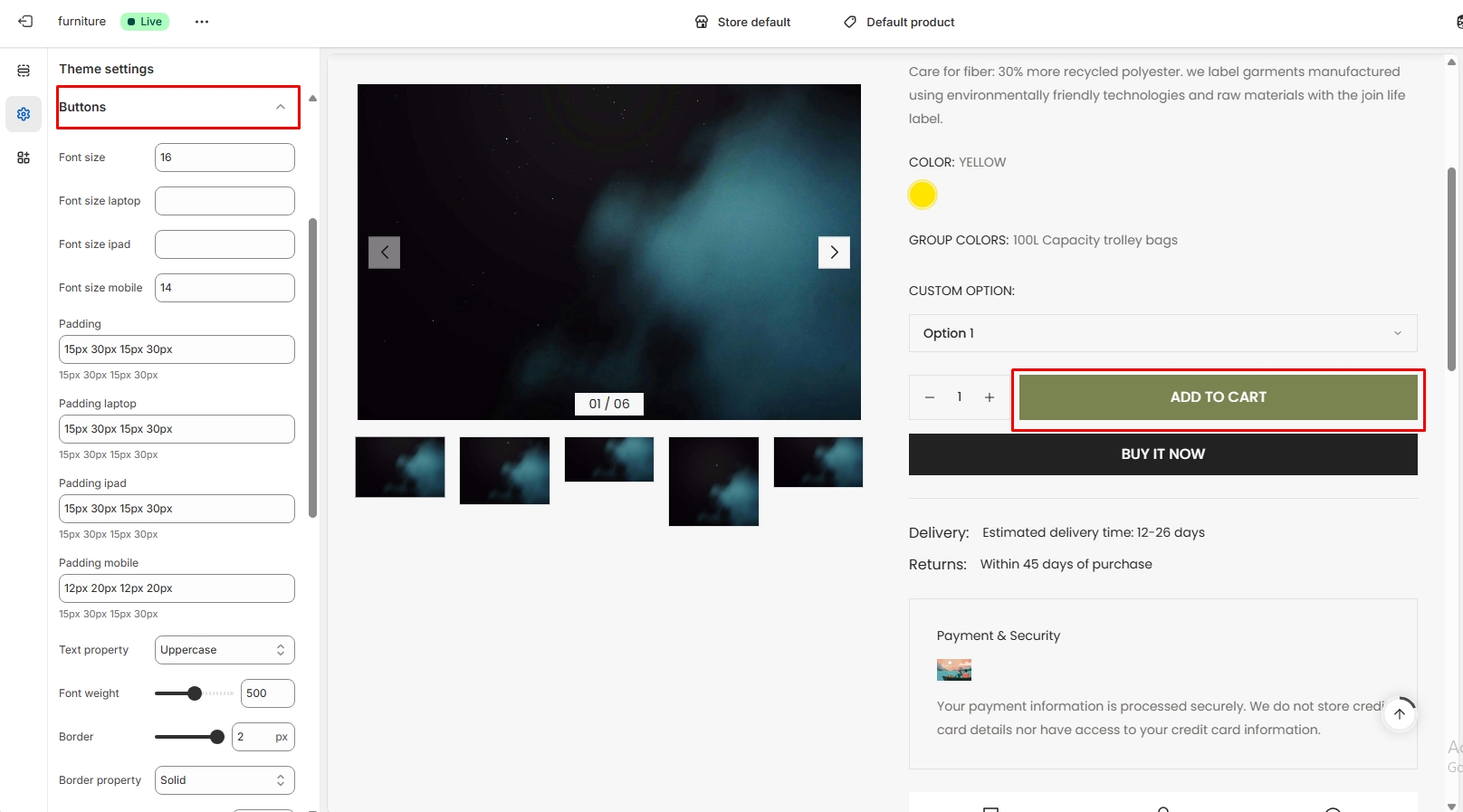 Left sidebar settings icon > Buttons setting > Button primary